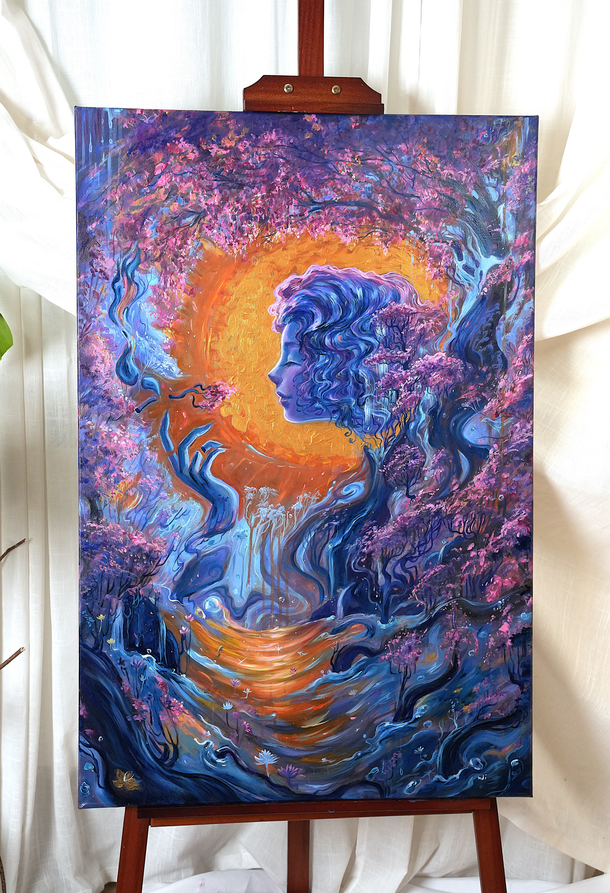 This painting´s tones changes a bit depending on the light source, cool light and warm light bring out the different hue shifts.