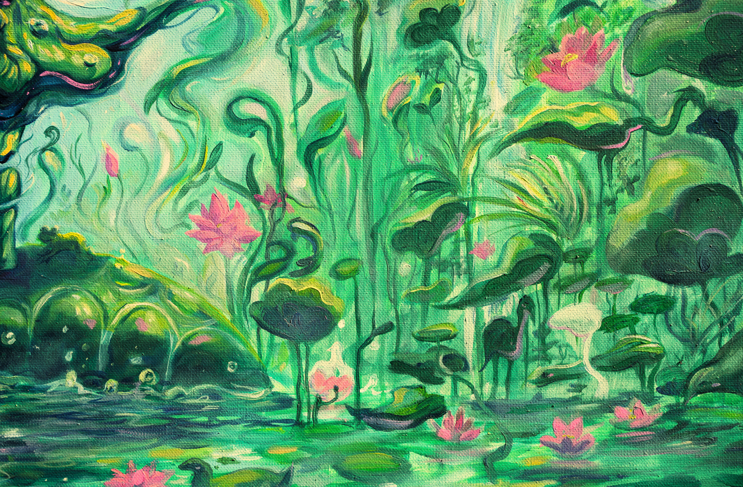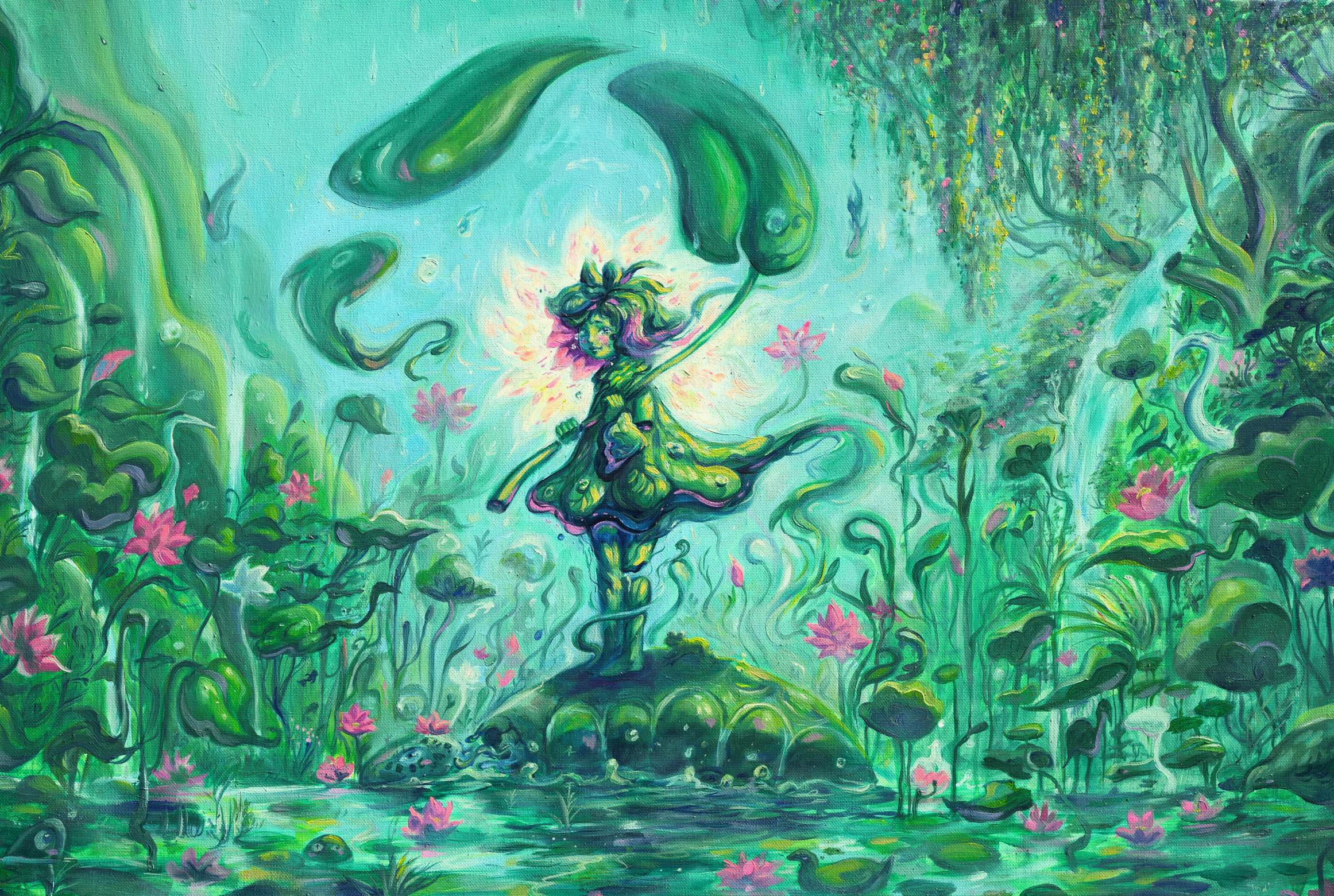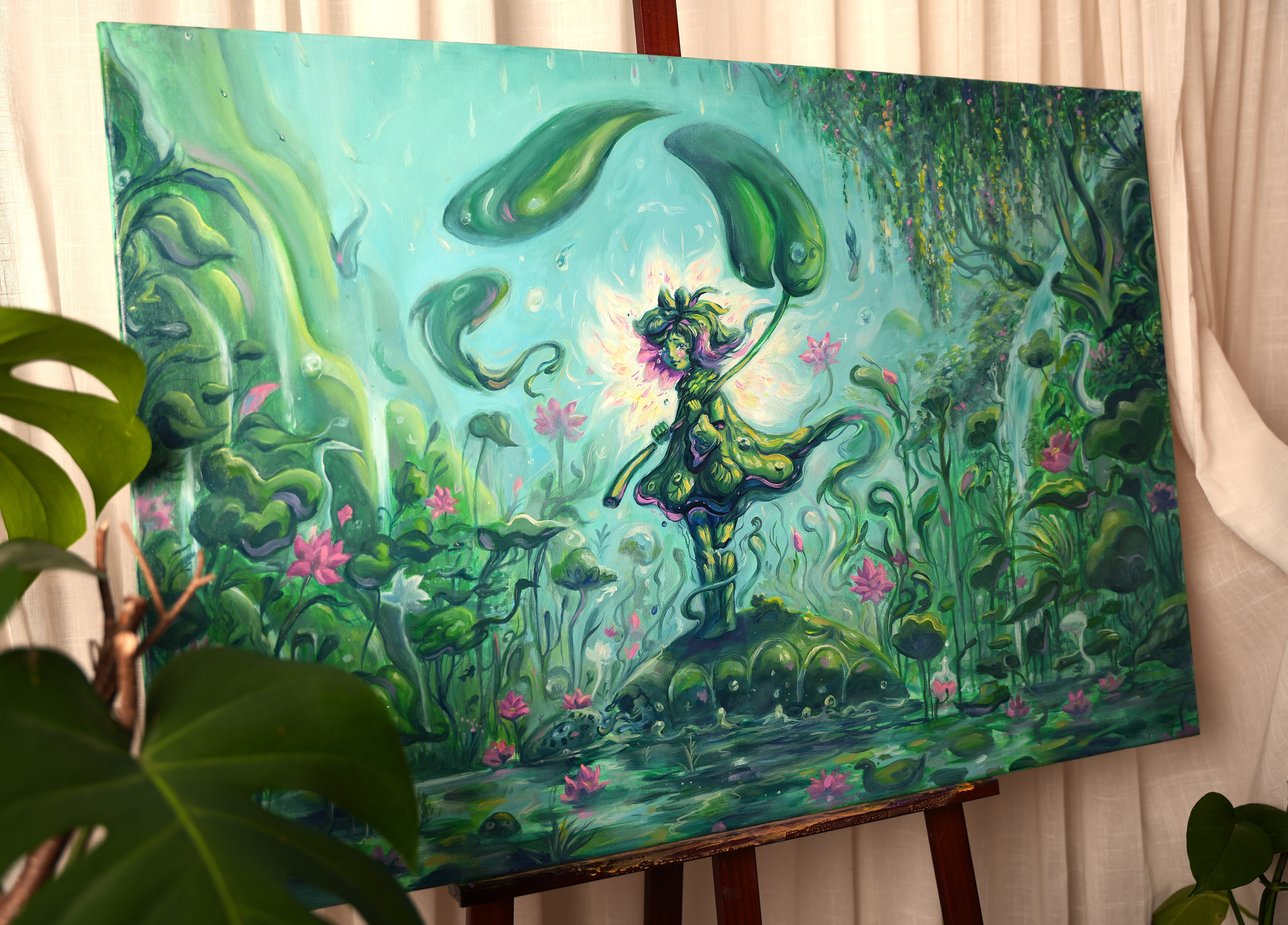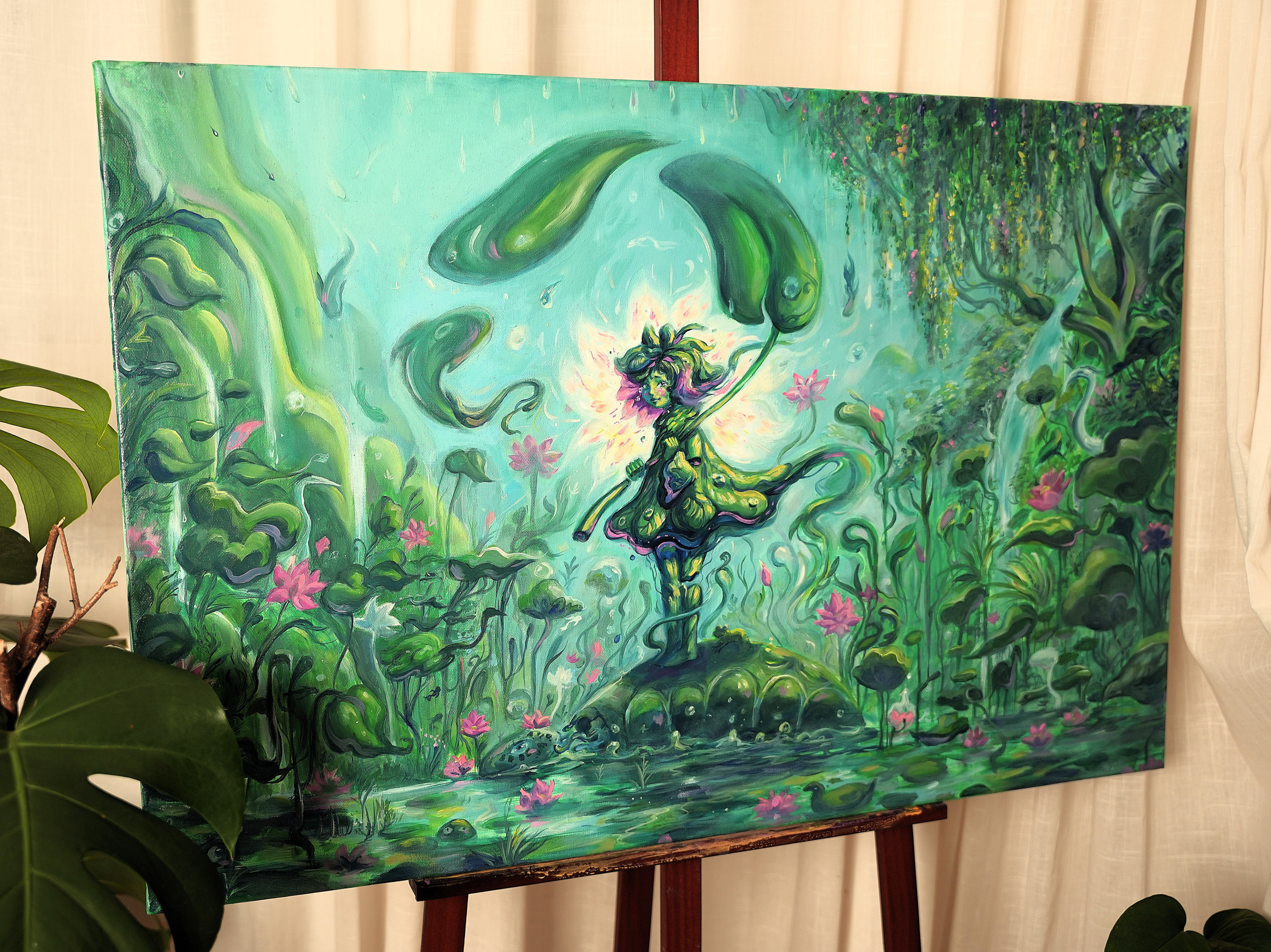 This painting is inspired by nostalgia of the 2000´s, fruitigeraero and old Dreamcast games, such as eco the dolphin, my weird fixation as a kid to watch animal documentaries and my love for the cyan sea which amazed me as a kid since I was born on an island.