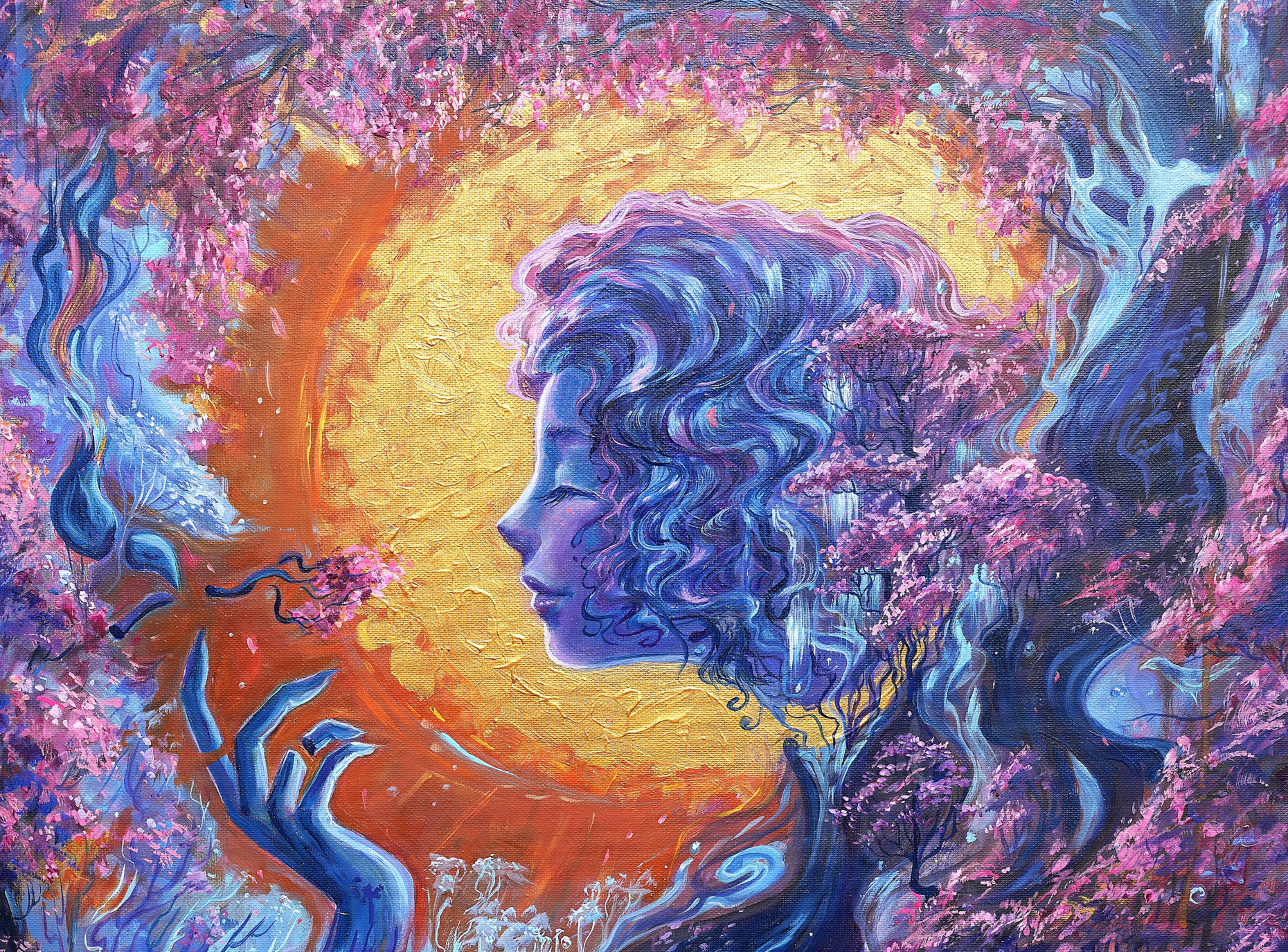 The grown part of a soul holds her hands gently under the small sun, that represents a younger part of the soul.
